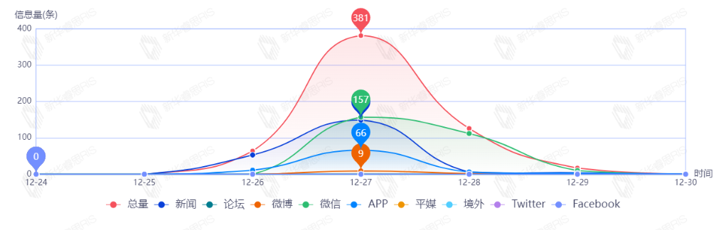 截至目前,該文章在互聯(lián)網(wǎng)上傳播總量589篇。其中12月27日是傳播的高峰期,共傳播381篇文章。各信源的信息發(fā)布情況中,微信占比最大,其次是新聞信息和APP,占比分別為51.01%、31.08%、15.90%。(數(shù)據(jù)來源:新華睿思數(shù)據(jù)云圖分析平臺(tái))