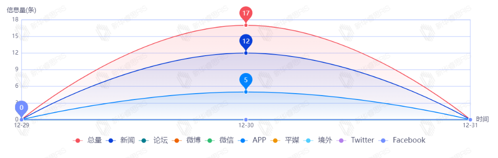 截至目前,該文章在互聯(lián)網(wǎng)上傳播總量17篇。其中12月30日是傳播的高峰期,共傳播17篇文章。各信源的信息發(fā)布情況中,新聞信息和APP占比分別為64.29%和35.71%。(數(shù)據(jù)來源:新華睿思數(shù)據(jù)云圖分析平臺(tái))