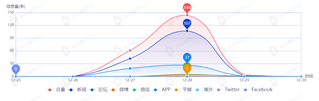 截至目前,該文章在互聯(lián)網(wǎng)上傳播總量209篇。其中12月28日是傳播的高峰期,共傳播144篇文章。各信源的信息發(fā)布情況中,新聞信息和APP占比最大,占比分別為65.88%和27.65%。(數(shù)據(jù)來源:新華睿思數(shù)據(jù)云圖分析平臺(tái))