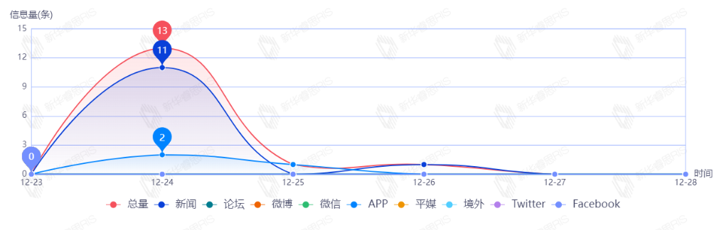 截至目前,該文章在互聯(lián)網(wǎng)上傳播總量15篇。其中12月24日是傳播的高峰期,共傳播13篇文章。各信源的信息發(fā)布情況中,新聞信息和APP占比分別為72.73%和27.27%。(數(shù)據(jù)來源:新華睿思數(shù)據(jù)云圖分析平臺(tái))