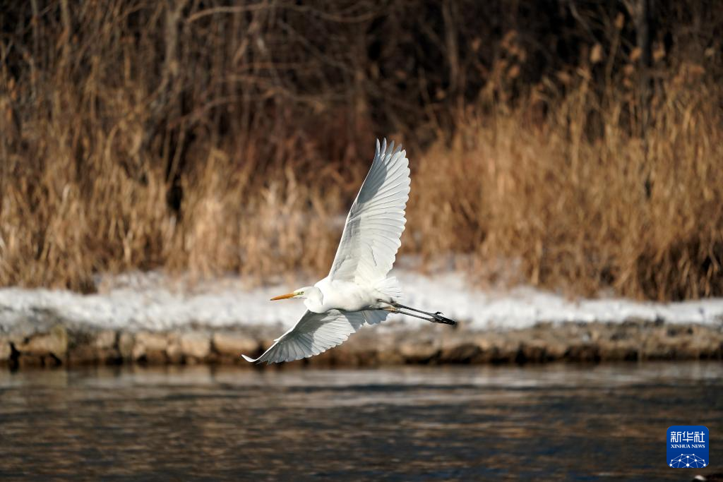 1月3日,在山西太原,白鹭在汾河上空飞翔。