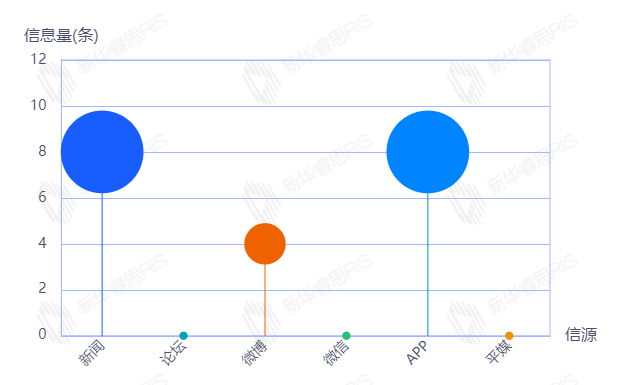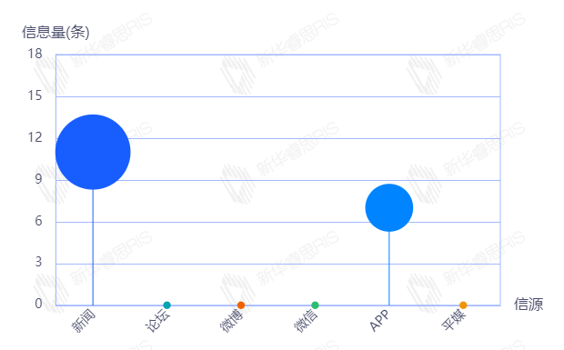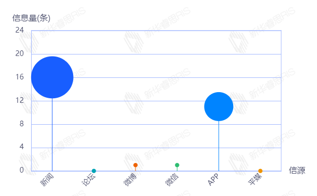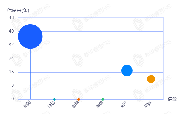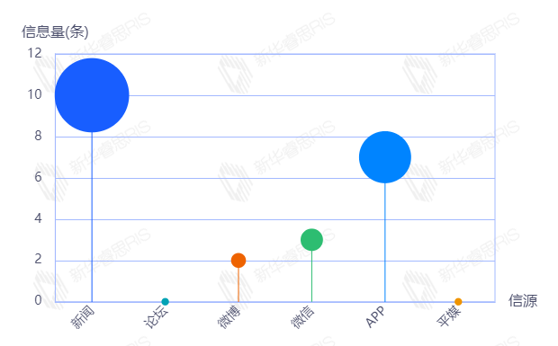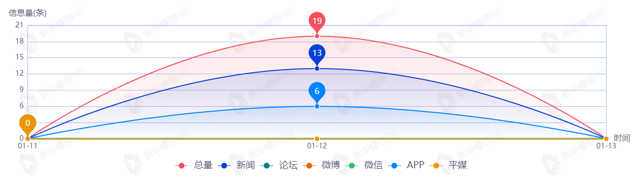 截至目前,該文章在互聯(lián)網(wǎng)上傳播總量19篇。其中1月12日是傳播的高峰期,共傳播19篇文章。各信源的信息發(fā)布情況中,新聞信息占比最大,其次是APP,占比分別為62.50%和37.50%。(數(shù)據(jù)來(lái)源:新華睿思數(shù)據(jù)云圖分析平臺(tái))