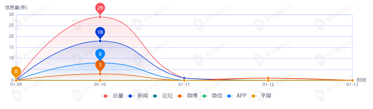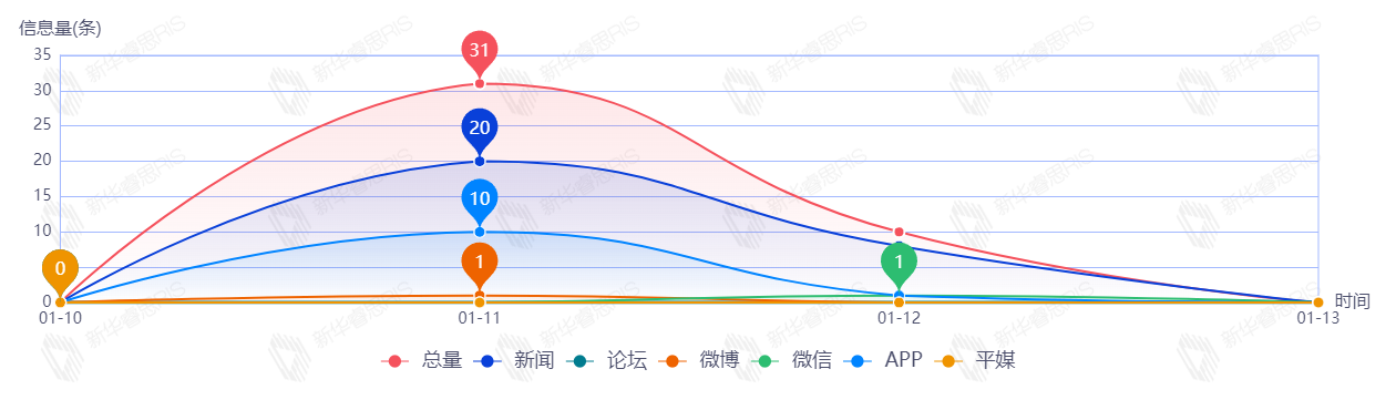 截至目前,該文章在互聯(lián)網(wǎng)上傳播總量41篇。其中1月11日是傳播的高峰期,共傳播31篇文章。各信源的信息發(fā)布情況中,新聞信息占比最大,其次是APP,占比分別為55.17%和37.93%。(數(shù)據(jù)來(lái)源:新華睿思數(shù)據(jù)云圖分析平臺(tái))