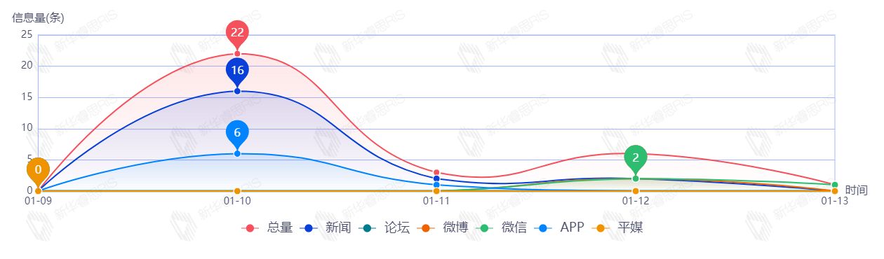 截至目前,該文章在互聯(lián)網(wǎng)上傳播總量32篇。其中1月10日是傳播的高峰期,共傳播22篇文章。各信源的信息發(fā)布情況中,新聞信息占比最大,其次是APP,占比分別為45.45%和31.82%。(數(shù)據(jù)來(lái)源:新華睿思數(shù)據(jù)云圖分析平臺(tái))
