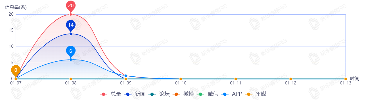 截至目前,該文章在互聯(lián)網(wǎng)上傳播總量21篇。其中1月8日是傳播的高峰期,共傳播20篇文章。各信源的信息發(fā)布情況中,新聞信息占比最大,其次是APP,占比分別為61.11%和38.89%。(數(shù)據(jù)來(lái)源:新華睿思數(shù)據(jù)云圖分析平臺(tái))