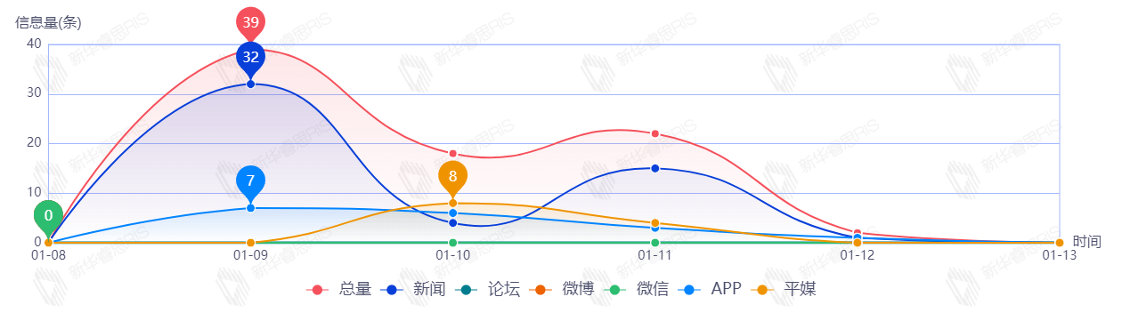 截至目前,該文章在互聯(lián)網(wǎng)上傳播總量81篇。其中1月9日是傳播的高峰期,共傳播39篇文章。各信源的信息發(fā)布情況中,新聞信息占比最大,其次是APP,占比分別為56.06%和25.76%。(數(shù)據(jù)來(lái)源:新華睿思數(shù)據(jù)云圖分析平臺(tái))