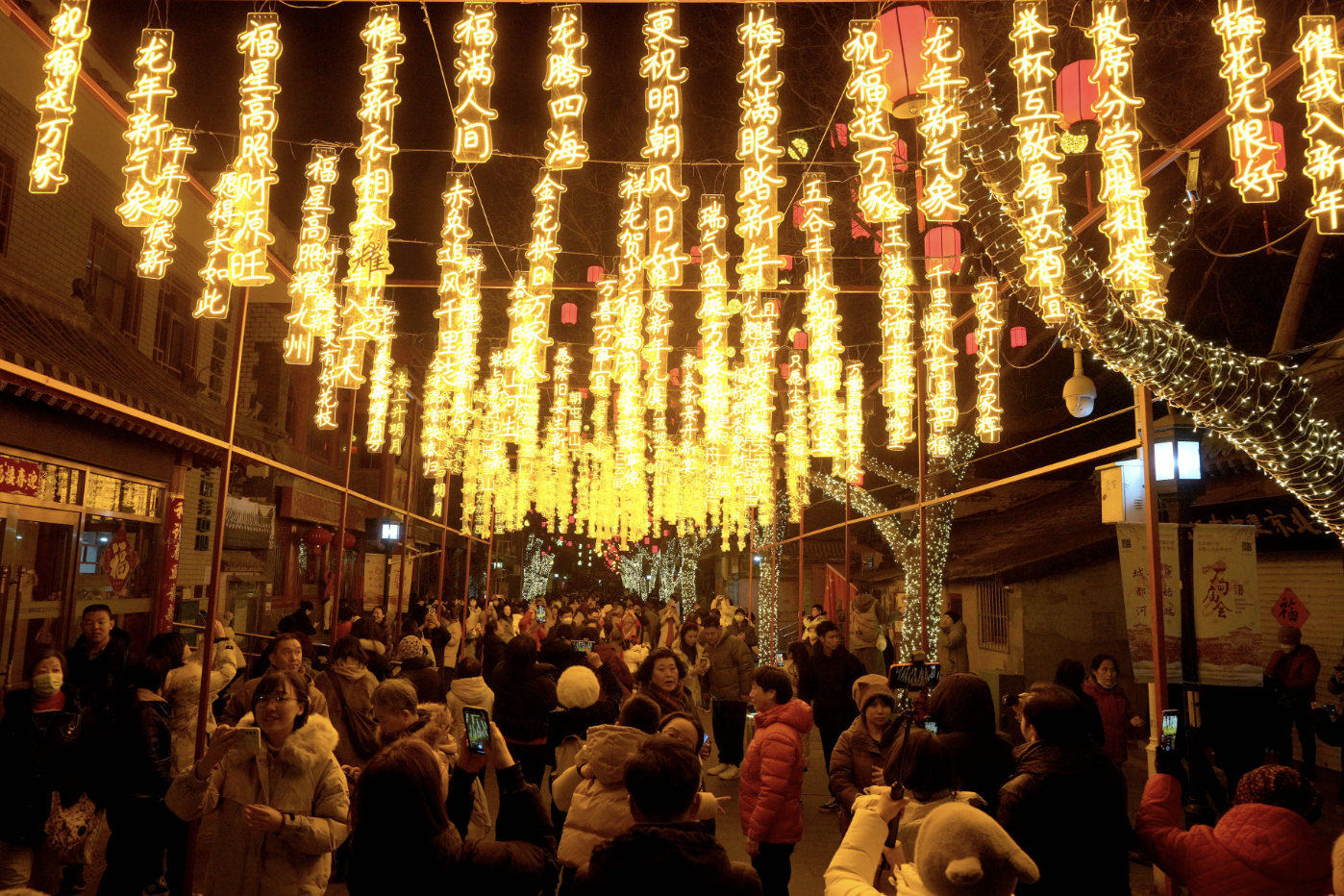 山西太原市钟楼街的灯光,唤起了市民苏爱珍对春节的美好回忆。今年,街上的老字号、品牌首店、市集等,以“龙”为主题进行了亮化装扮。透过流光溢彩的灯光,不远处传统门楼的歇山顶若隐若现,展现古代将军们英武之气的舞蹈《相见欢》巡回上演……灯火和声乐共同营造出欢乐祥和的过年氛围。