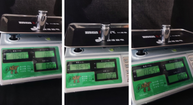 店主分别按下“M1、M2、M3、计数、电压、动态”等几个按键,同一桶洗洁精居然分别显示出“1175、1230、1285、1345、1400、1455”几个称重数值,最大增重335克。