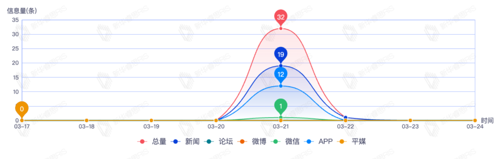 截至目前,該文章在互聯(lián)網(wǎng)上傳播總量33篇。其中3月21日是傳播的高峰期,共傳播32篇文章。各信源的信息發(fā)布情況中,新聞信息占比最大,其次是APP和微信,占比分別為56.67%、40.00%、3.33%。(數(shù)據(jù)來源:新華睿思數(shù)據(jù)云圖分析平臺)
