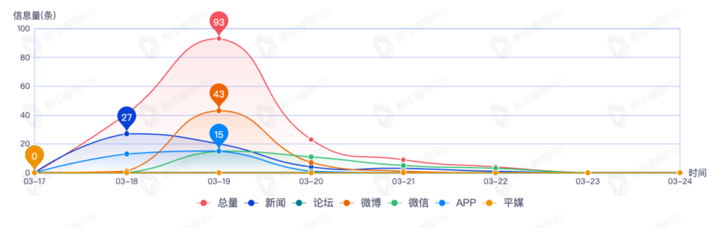 截至目前,該文章在互聯(lián)網(wǎng)上傳播總量170篇。其中3月19日是傳播的高峰期,共傳播93篇文章。各信源的信息發(fā)布情況中,微博信息占比最大,其次是新聞和微信,占比分別為32.50%、28.13%、21.25%。(數(shù)據(jù)來源:新華睿思數(shù)據(jù)云圖分析平臺)