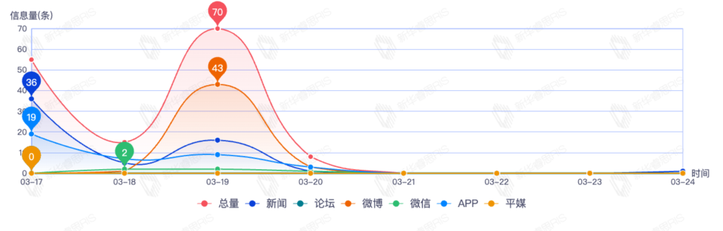 截至目前,該文章在互聯(lián)網(wǎng)上傳播總量149篇。其中3月19日是傳播的高峰期,共傳播70篇文章。各信源的信息發(fā)布情況中,新聞信息占比最大,其次是微博和APP,占比分別為36.17%、33.33%、26.95%。(數(shù)據(jù)來源:新華睿思數(shù)據(jù)云圖分析平臺)