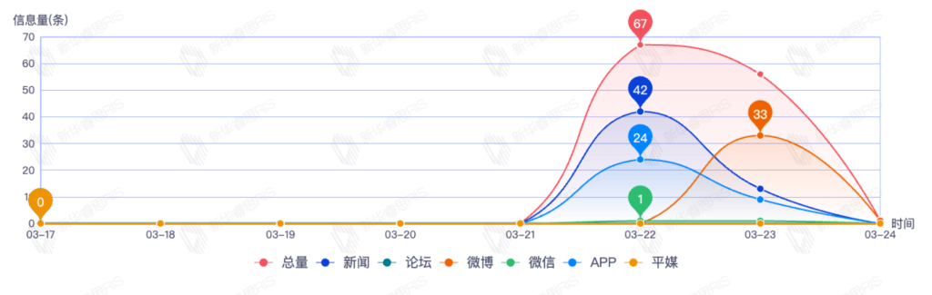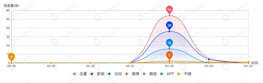截至目前,該文章在互聯(lián)網(wǎng)上傳播總量188篇。其中3月22日是傳播的高峰期,共傳播103篇文章。各信源的信息發(fā)布情況中,微博信息占比最大,其次是新聞和APP,占比分別為38.55%、31.84%、17.88%。(數(shù)據(jù)來源:新華睿思數(shù)據(jù)云圖分析平臺)