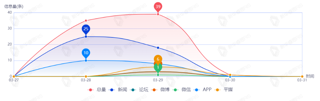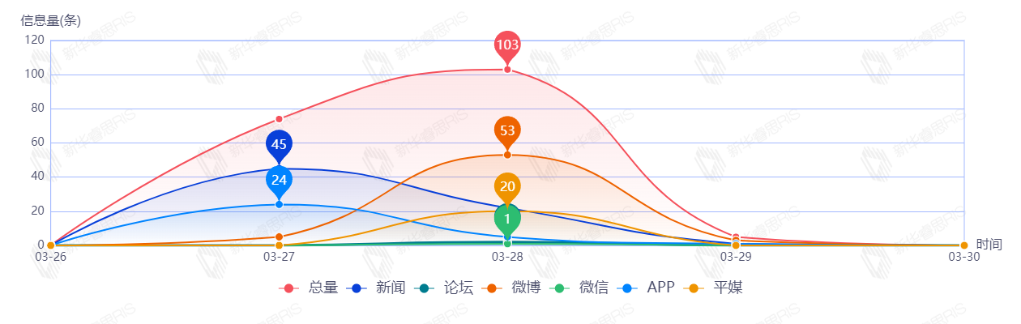 截至目前,該文章在互聯網上傳播總量182篇。其中3月28日是傳播的高峰期,共傳播103篇文章。各信源的信息發(fā)布情況中,新聞信息占比最大,其次是微博和APP,占比分別為35.23%、34.66%、17.05%。(數據來源:新華睿思數據云圖分析平臺)