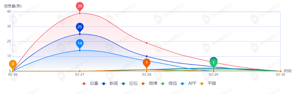 截至目前,該文章在互聯網上傳播總量75篇。其中3月29日是傳播的高峰期,共傳播39篇文章。各信源的信息發(fā)布情況中,新聞信息和APP占比較大,分別為57.33%和24.00%。(數據來源:新華睿思數據云圖分析平臺)