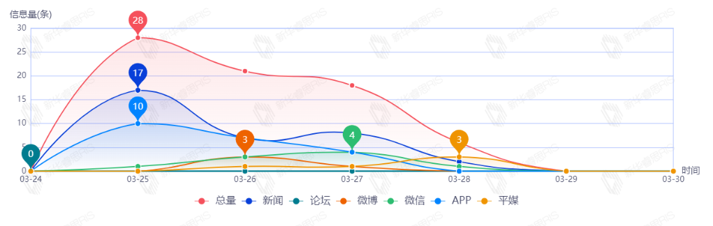 截至目前,該文章在互聯網上傳播總量73篇。其中3月25日是傳播的高峰期,共傳播28篇文章。各信源的信息發(fā)布情況中,新聞信息占比最大,其次是APP和微信,占比分別為46.58%、28.77%、12.33%。(數據來源:新華睿思數據云圖分析平臺)