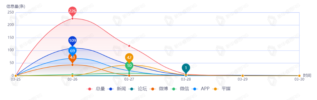 截至目前,該文章在互聯網上傳播總量353篇。其中3月26日是傳播的高峰期,共傳播226篇文章。各信源的信息發(fā)布情況中,新聞信息占比最大,其次是APP和平媒,占比分別為44.89%、25.28%、12.78%。(數據來源:新華睿思數據云圖分析平臺)