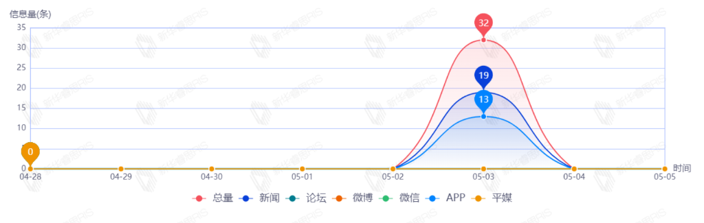 截至目前,該文章在互聯(lián)網(wǎng)上傳播總量共32篇。其中,5月3日是傳播的高峰期,共傳播32篇文章。各信源的信息發(fā)布情況中,新聞信息占比最大,其次是APP,占比分別為59.38%、40.63%。(數(shù)據(jù)來源:新華睿思·數(shù)媒智慧分析平臺)