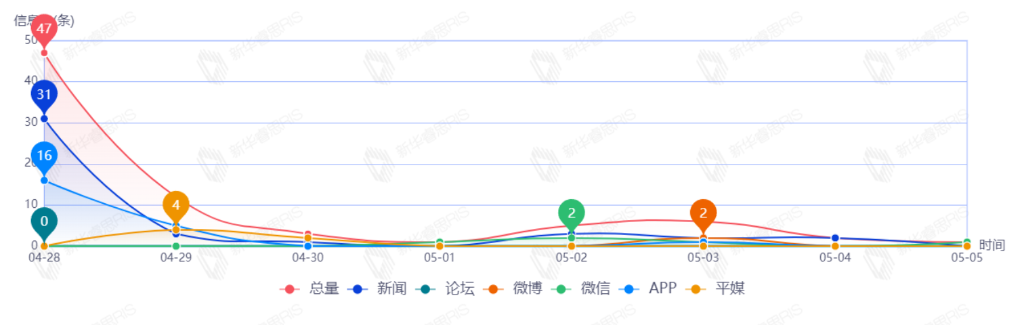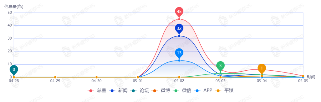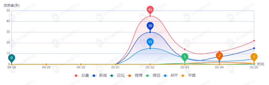 截至目前,該文章在互聯(lián)網(wǎng)上傳播總量共93篇。其中,5月2日是傳播的高峰期,共傳播45篇文章。各信源的信息發(fā)布情況中,新聞信息占比最大,其次是APP和微博,占比分別為62.37%、31.18%、4.30%。(數(shù)據(jù)來源:新華睿思·數(shù)媒智慧分析平臺)