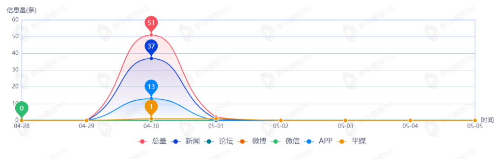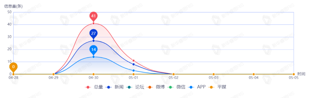 截至目前,該文章在互聯(lián)網(wǎng)上傳播總量共52篇。其中,4月30日是傳播的高峰期,共傳播41篇文章。各信源的信息發(fā)布情況中,新聞信息占比最大,其次是APP,占比分別為67.31%、32.69%。(數(shù)據(jù)來源:新華睿思·數(shù)媒智慧分析平臺)