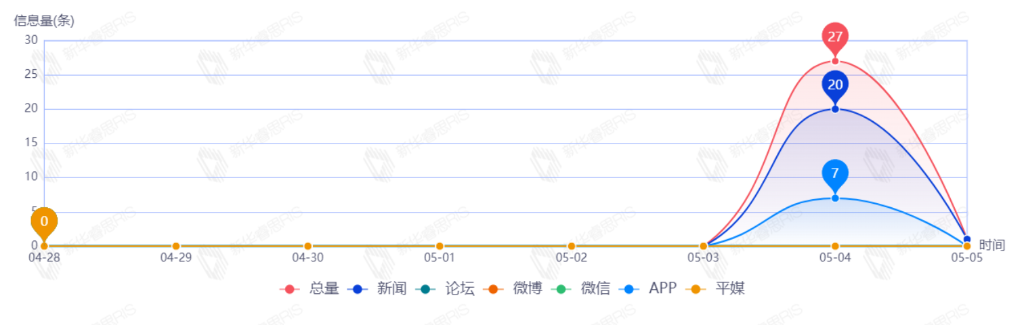 截至目前,該文章在互聯(lián)網(wǎng)上傳播總量共28篇。其中,5月4日是傳播的高峰期,共傳播27篇文章。各信源的信息發(fā)布情況中,新聞信息占比最大,其次是APP,占比分別為75.00%、25.00%。(數(shù)據(jù)來源:新華睿思·數(shù)媒智慧分析平臺)