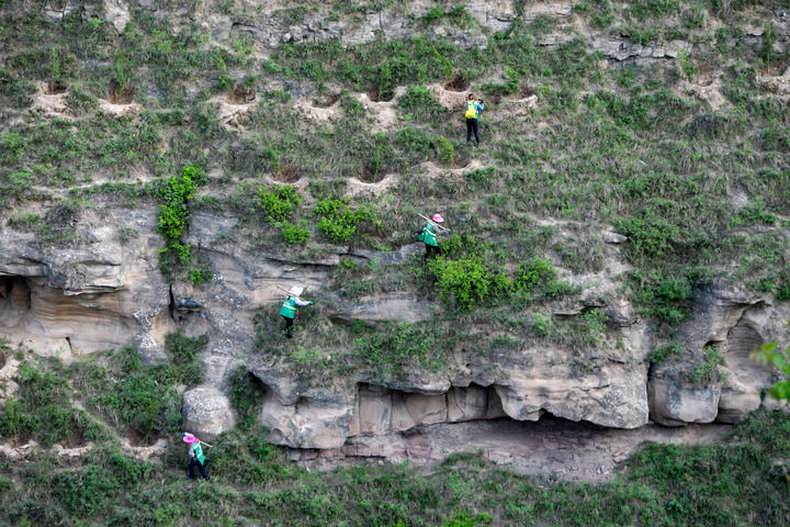 黃河岸邊,群山連綿。在山西省呂梁市石樓縣沿黃一號旅游公路邊的荒山荒坡上,有一群忙碌的“植綠人”。他們身背樹苗,手持鋤頭,在懸崖峭壁間行走,為缺林少綠的荒山荒坡植樹添綠。(新華社記者詹彥)