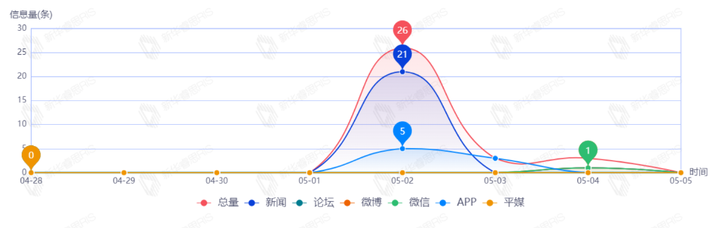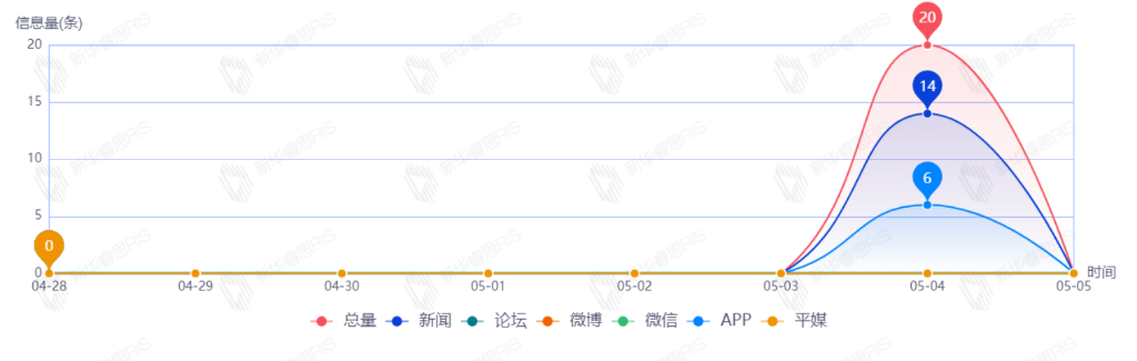 截至目前,該文章在互聯(lián)網(wǎng)上傳播總量共20篇。其中,5月4日是傳播的高峰期,共傳播20篇文章。各信源的信息發(fā)布情況中,新聞信息占比最大,其次是APP,占比分別為70.00%、30.00%。(數(shù)據(jù)來源:新華睿思·數(shù)媒智慧分析平臺)