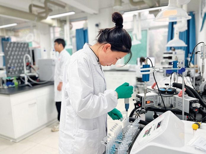 山西大学忻州创新生态研究院特种污水低碳处理实验室,科研人员正在做实验(2024年4月1日摄) 王怡静摄