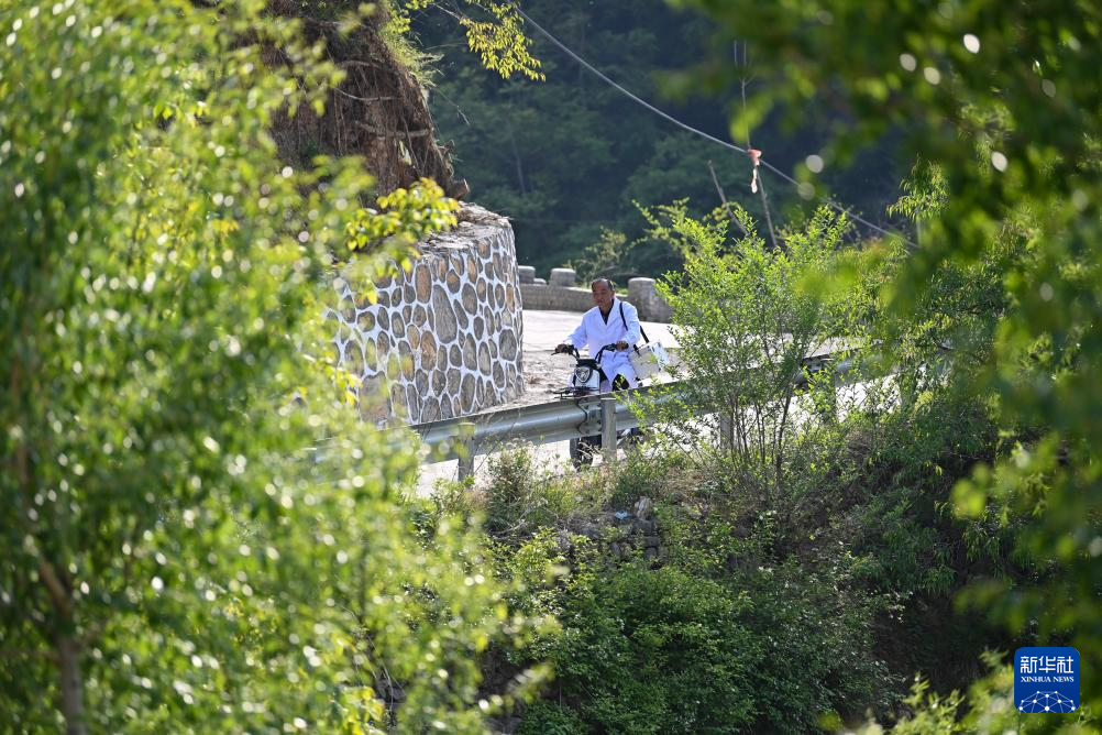 在平顺县东寺头乡七子沟村,王文吉骑电动车行驶在出诊的路上(5月8日摄)。