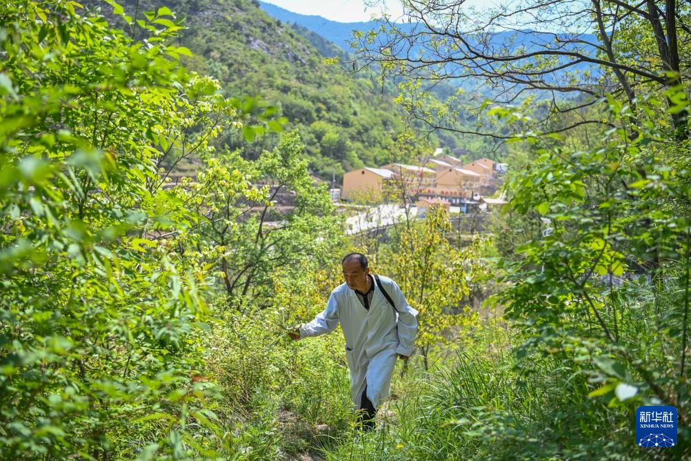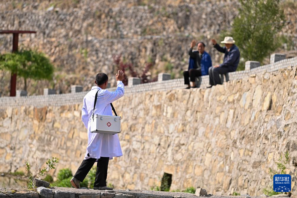 在平顺县东寺头乡七子沟村,王文吉(左)在出诊路上向沿途遇到的村民打招呼(5月8日摄)。