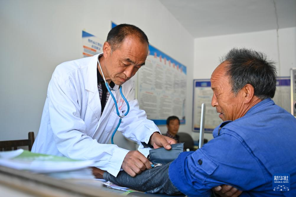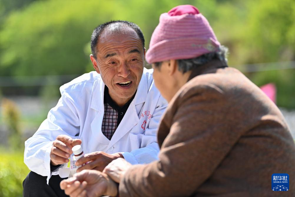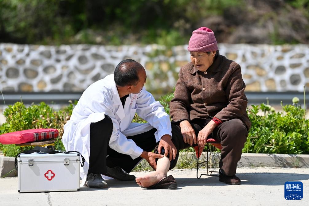 在平顺县东寺头乡七子沟村,王文吉(左)为村民看病(5月9日摄)。