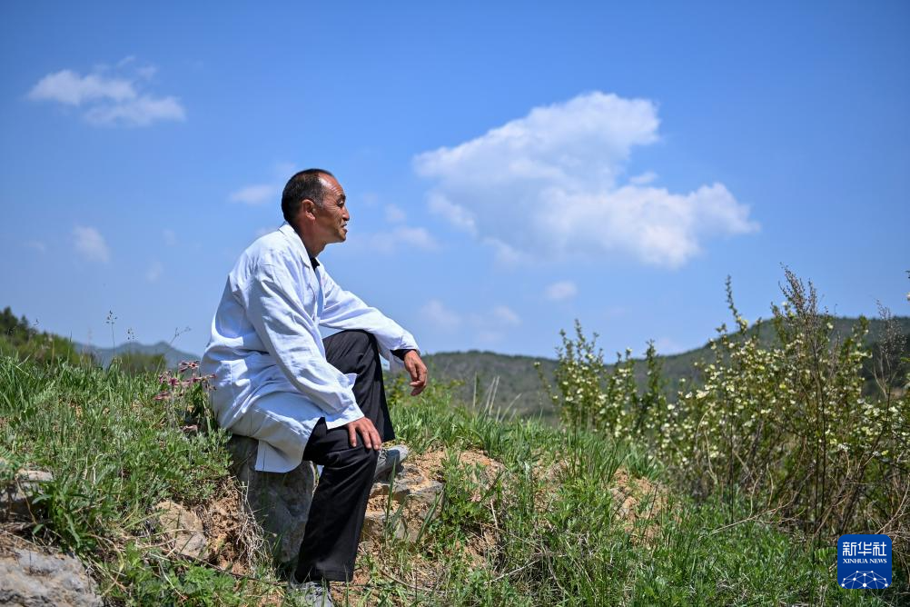 在平顺县东寺头乡七子沟村,王文吉在一处田地短暂休息(5月9日摄)。