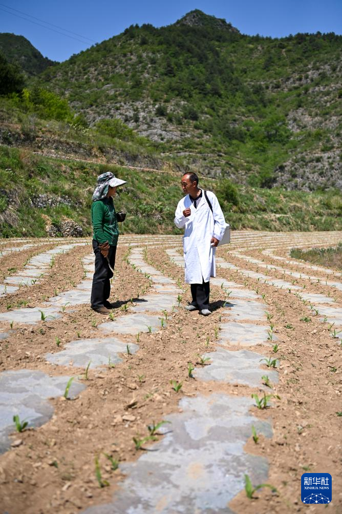 在平顺县东寺头乡七子沟村,王文吉(左)向村民叮嘱用药(5月9日摄)。