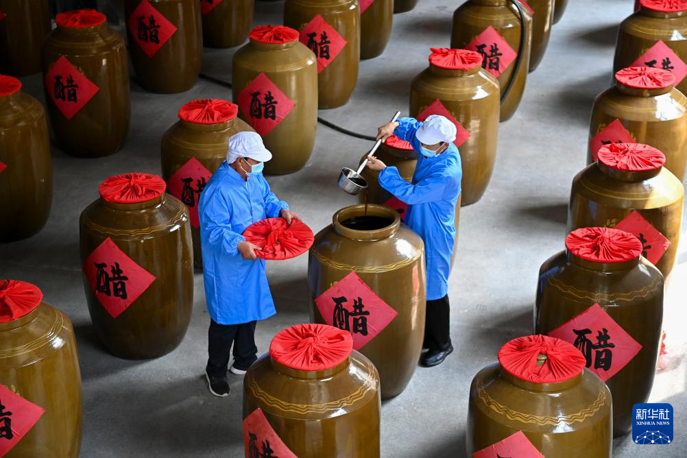 工作人员在平顺县龙溪镇龙镇村农旅产业融合发展示范园内查看醋的成色(5月10日摄)。
