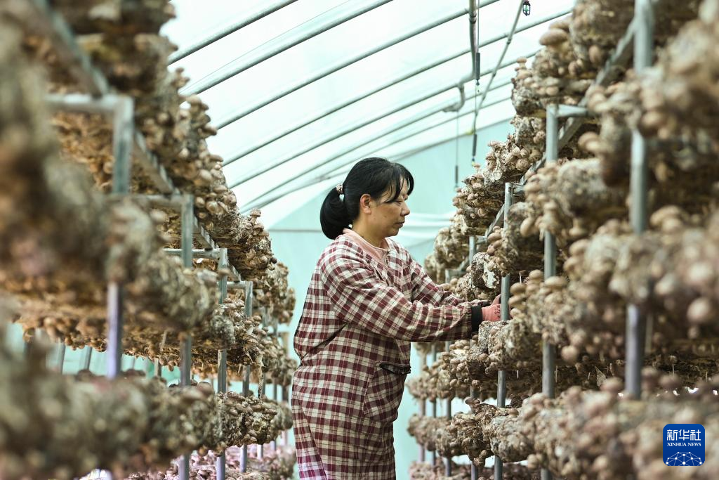 村民在平顺县龙溪镇龙镇村农旅产业融合发展示范园的香菇大棚里采摘(5月10日摄)。