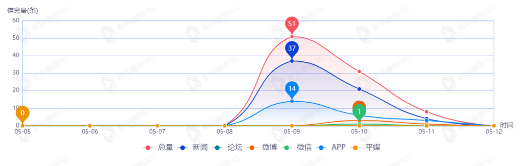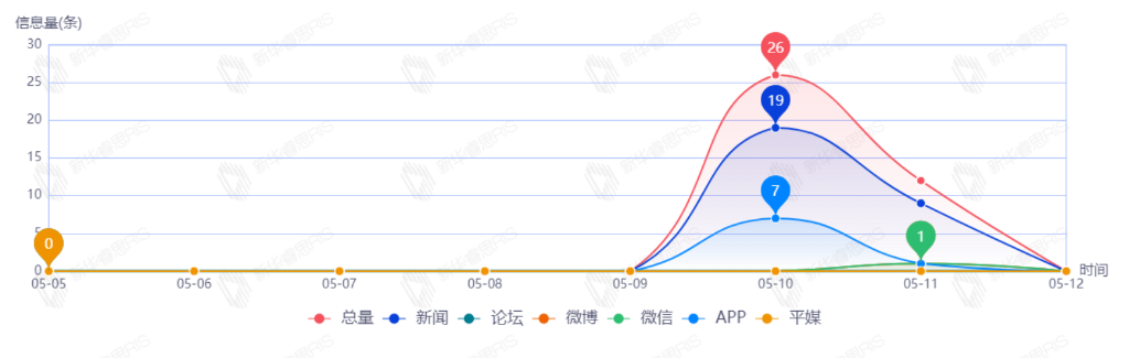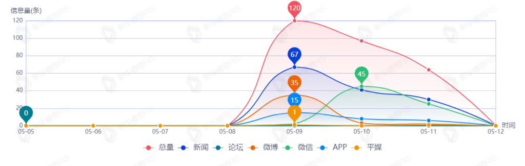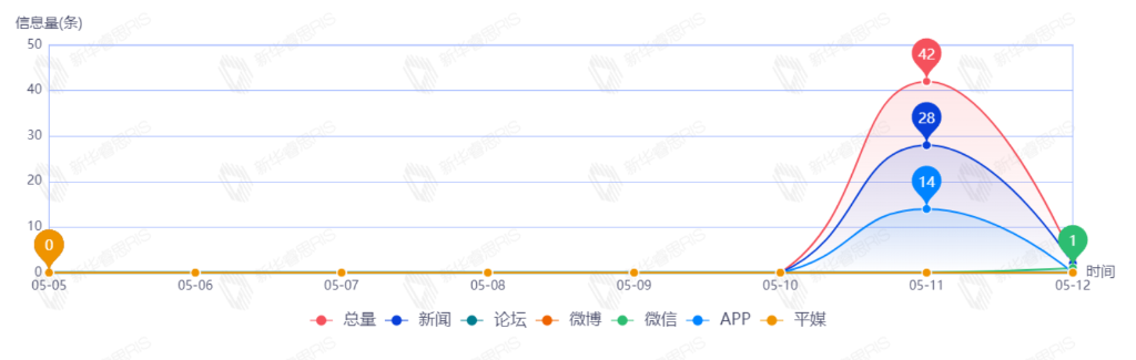 截至目前,該文章在互聯(lián)網(wǎng)上傳播總量45篇。其中5月11日是傳播的高峰期,共傳播42篇文章。各信源的信息發(fā)布情況中,新聞信息占比最大,其次是APP和微信,占比分別為47.67%、26.74%、12.79%。(數(shù)據(jù)來源:新華睿思數(shù)據(jù)云圖分析平臺)