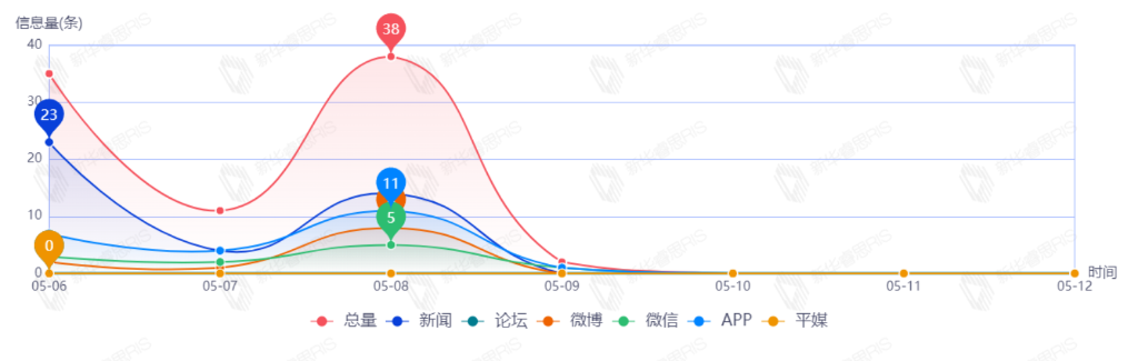 截至目前,該文章在互聯(lián)網(wǎng)上傳播總量86篇。其中5月8日是傳播的高峰期,共傳播38篇文章。各信源的信息發(fā)布情況中,新聞信息占比最大,其次是APP和微信,占比分別為47.67%、26.74%、12.79%。(數(shù)據(jù)來源:新華睿思數(shù)據(jù)云圖分析平臺)