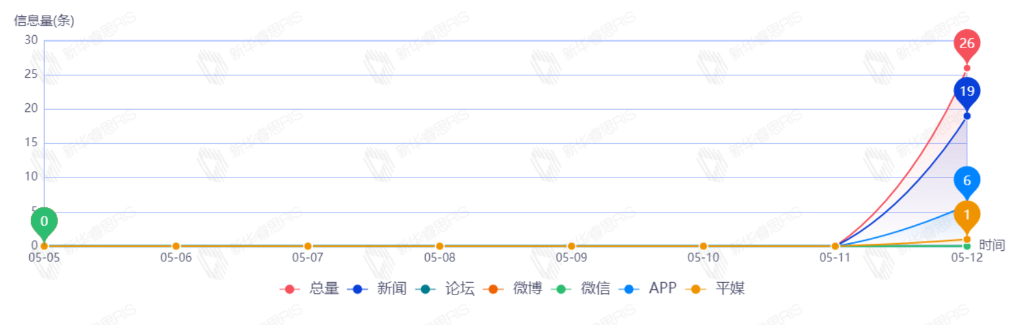 截至目前,該文章在互聯(lián)網(wǎng)上傳播總量26篇。其中5月12日是傳播的高峰期,共傳播26篇文章。各信源的信息發(fā)布情況中,新聞信息占比最大,其次是APP和平媒,占比分別為73.08%、23.08%、3.85%。(數(shù)據(jù)來源:新華睿思數(shù)據(jù)云圖分析平臺)