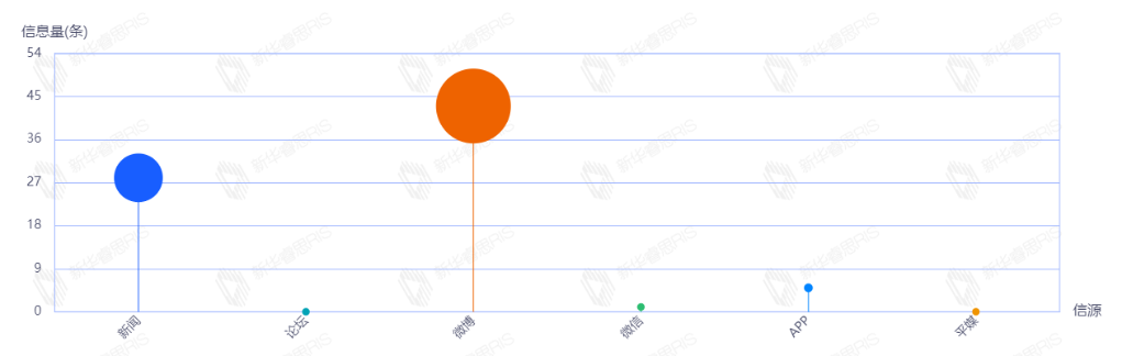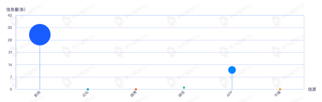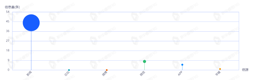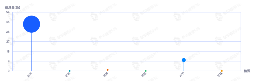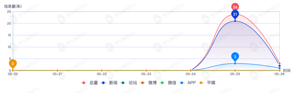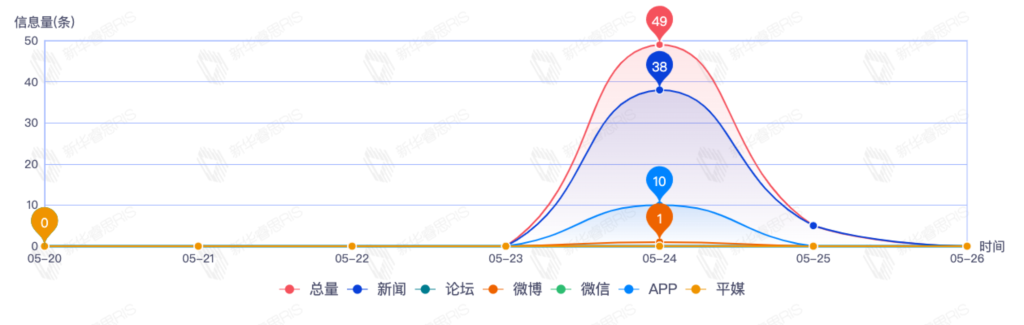 截至目前,該文章在互聯(lián)網(wǎng)上傳播總量54篇。其中5月24日是傳播的高峰期,共傳播49篇文章。各信源的信息發(fā)布情況中,新聞信息占比最大,其次是APP和微博,信息量分別為43、10、1,占比分別為79.63%、18.52%、1.85%。(數(shù)據(jù)來源:新華睿思數(shù)據(jù)云圖分析平臺(tái))