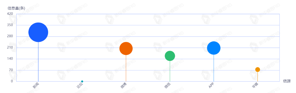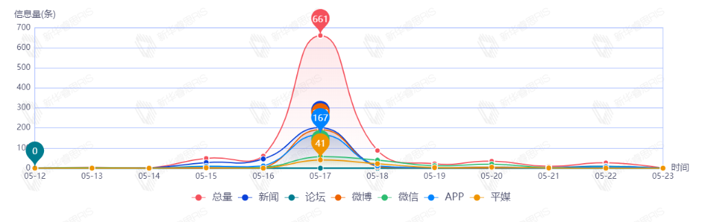 截至目前,該文章在互聯(lián)網(wǎng)上傳播總量957篇。其中5月17日是傳播的高峰期,共傳播661篇文章。各信源的信息發(fā)布情況中,新聞信息占比最大,其次是APP和微博,信息量分別為306、208、205,占比分別為32.14%、21.85%、21.53%。(數(shù)據(jù)來源:新華睿思數(shù)據(jù)云圖分析平臺(tái))