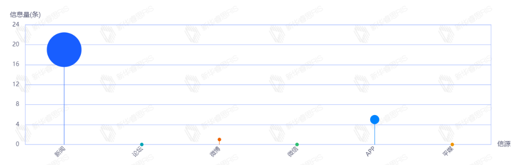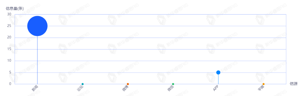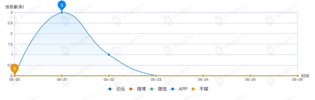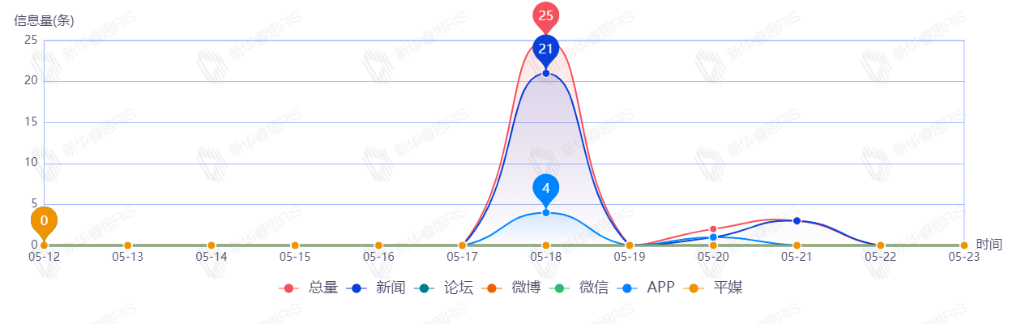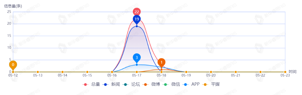 截至目前,該文章在互聯(lián)網(wǎng)上傳播總量25篇。其中5月17日是傳播的高峰期,共傳播22篇文章。各信源的信息發(fā)布情況中,新聞信息占比最大,其次是APP和微博,信息量分別為19、5、1,占比分別為76.00%、20.00%、4.00%。(數(shù)據(jù)來源:新華睿思數(shù)據(jù)云圖分析平臺(tái))