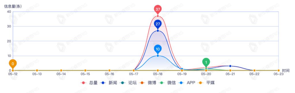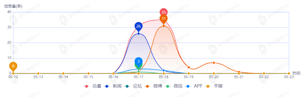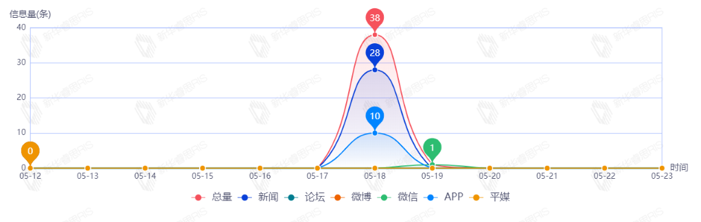 截至目前,該文章在互聯(lián)網(wǎng)上傳播總量39篇。其中5月18日是傳播的高峰期,共傳播38篇文章。各信源的信息發(fā)布情況中,新聞信息占比最大,其次是APP和微信,信息量分別為28、10、1,占比分別為71.79%、25.64%、2.56%。(數(shù)據(jù)來源:新華睿思數(shù)據(jù)云圖分析平臺(tái))