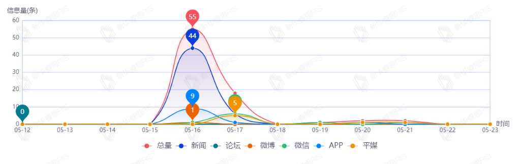 截至目前,該文章在互聯(lián)網(wǎng)上傳播總量78篇。其中5月16日是傳播的高峰期,共傳播55篇文章。各信源的信息發(fā)布情況中,新聞信息占比最大,其次是APP和微信,信息量分別為50、11、9,占比分別為64.10%、14.10%、11.54%。(數(shù)據(jù)來源:新華睿思數(shù)據(jù)云圖分析平臺(tái))