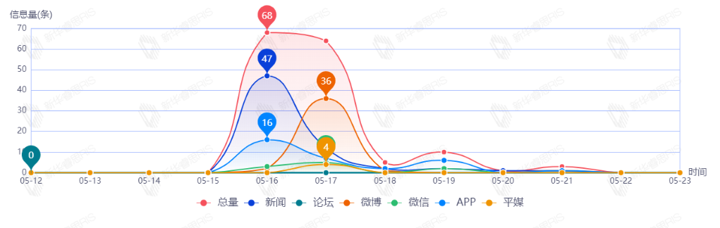 截至目前,該文章在互聯(lián)網(wǎng)上傳播總量151篇。其中5月16日是傳播的高峰期,共傳播68篇文章。各信源的信息發(fā)布情況中,新聞信息占比最大,其次是微博和APP,信息量分別為65、40、32,占比分別為43.05%、26.49%、21.19%。(數(shù)據(jù)來源:新華睿思數(shù)據(jù)云圖分析平臺(tái))