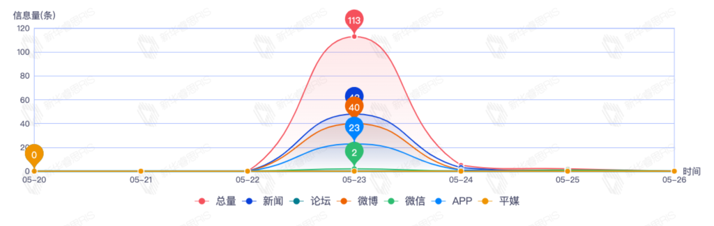 截至目前,該文章在互聯(lián)網(wǎng)上傳播總量120篇。其中5月23日是傳播的高峰期,共傳播113篇文章。各信源的信息發(fā)布情況中,新聞信息占比最大,其次是微博和APP,信息量分別為51、42、24,占比分別為42.50%、35.00%、20.00%。(數(shù)據(jù)來源:新華睿思數(shù)據(jù)云圖分析平臺(tái))