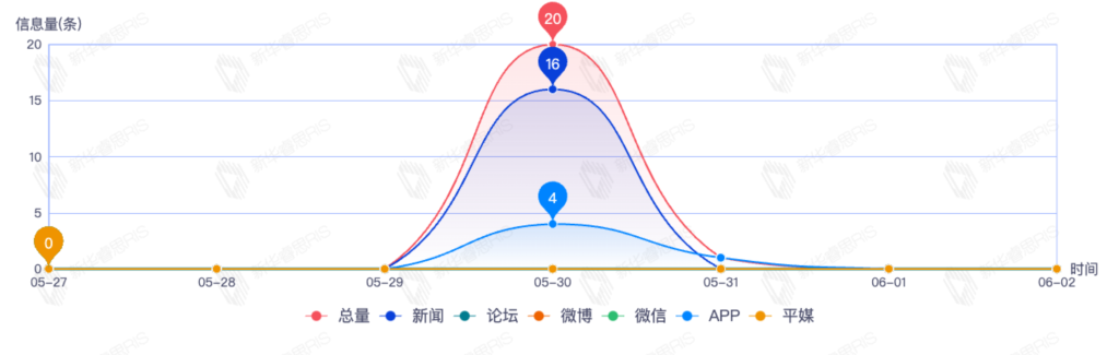 截至目前,該文章在互聯(lián)網(wǎng)上傳播總量21篇。其中5月30日是傳播的高峰期,共傳播20篇文章。各信源的信息發(fā)布情況中,新聞信息占比最大,其次是APP,占比分別為76.19%、23.81%。(數(shù)據(jù)來源:新華睿思數(shù)據(jù)云圖分析平臺)