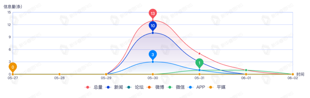 截至目前,該文章在互聯(lián)網(wǎng)上傳播總量19篇。其中5月30日是傳播的高峰期,共傳播13篇文章。各信源的信息發(fā)布情況中,新聞信息占比最大,其次是APP和微信,占比分別為68.42%、21.05%、10.53%。(數(shù)據(jù)來源:新華睿思數(shù)據(jù)云圖分析平臺)