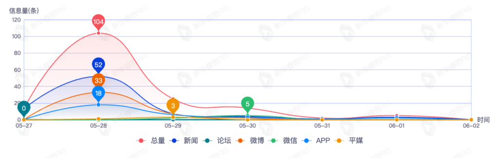 截至目前,該文章在互聯(lián)網(wǎng)上傳播總量163篇。其中5月28日是傳播的高峰期,共傳播104篇文章。各信源的信息發(fā)布情況中,新聞信息占比最大,其次是微博和APP,占比分別為49.08%、25.77%、18.40%。(數(shù)據(jù)來源:新華睿思數(shù)據(jù)云圖分析平臺)