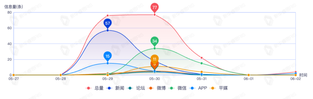 截至目前,該文章在互聯(lián)網(wǎng)上傳播總量179篇。其中5月30日是傳播的高峰期,共傳播77篇文章。各信源的信息發(fā)布情況中,新聞信息占比最大,其次是微信和APP,占比分別為43.58%、27.93%、12.85%。(數(shù)據(jù)來源:新華睿思數(shù)據(jù)云圖分析平臺)