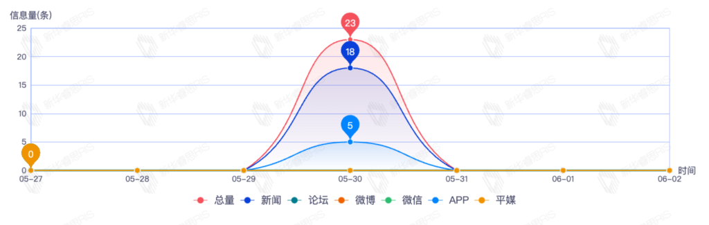 截至目前,該文章在互聯(lián)網(wǎng)上傳播總量23篇。其中5月30日是傳播的高峰期,共傳播23篇文章。各信源的信息發(fā)布情況中,新聞信息占比最大,其次是APP,占比分別為78.26%、21.74%。(數(shù)據(jù)來源:新華睿思數(shù)據(jù)云圖分析平臺)