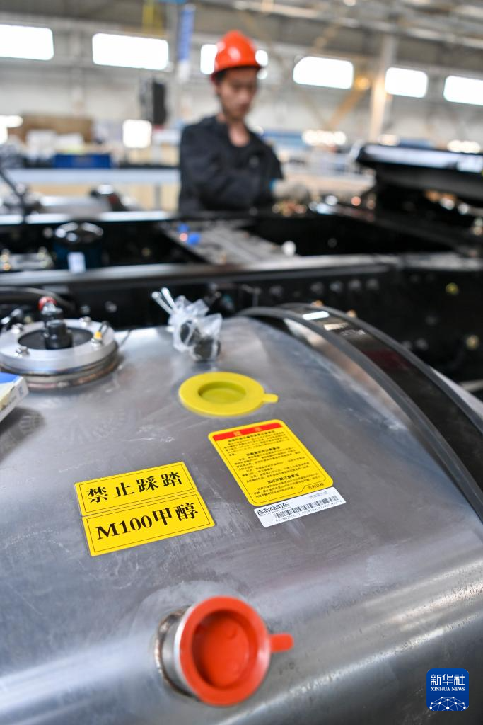 这是4月1日在位于山西省晋中市榆次区的山西新能源汽车工业有限公司(吉利晋中基地)拍摄的重卡甲醇箱。